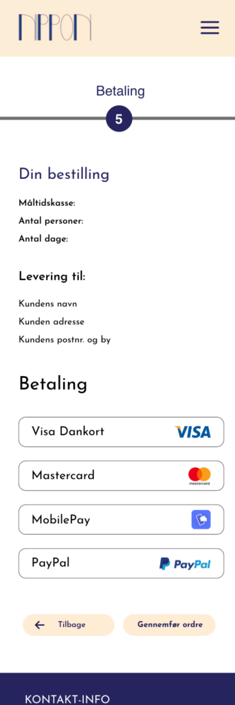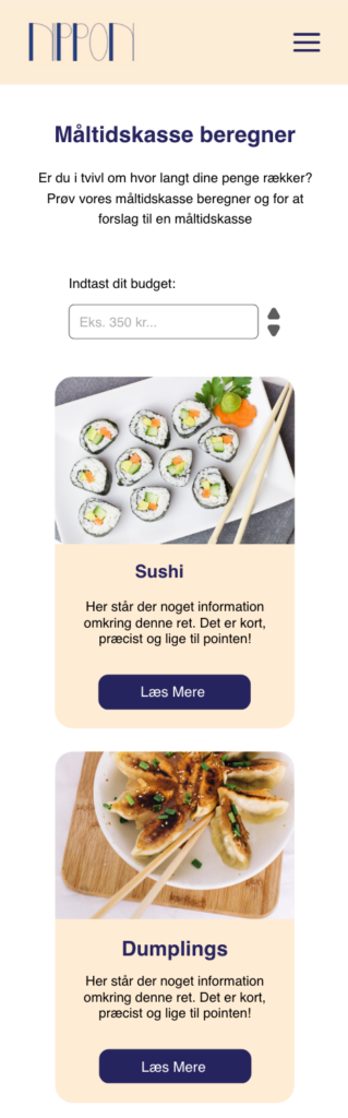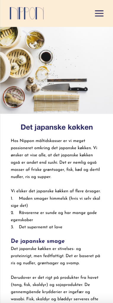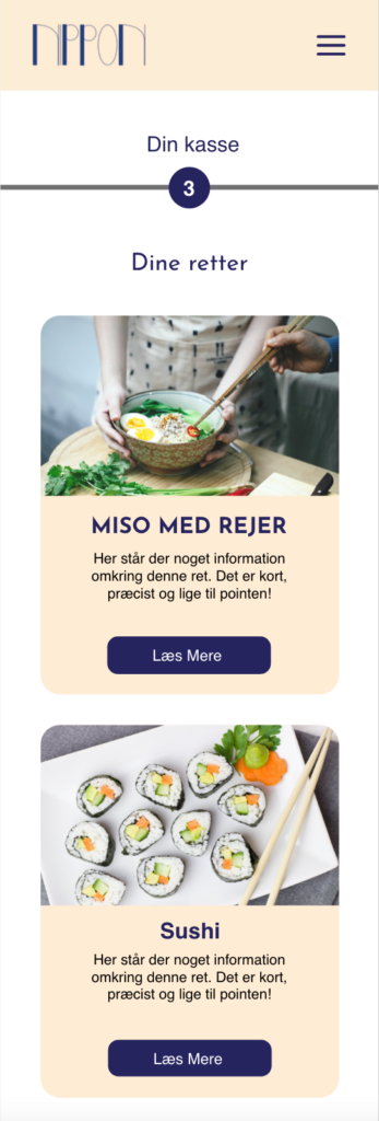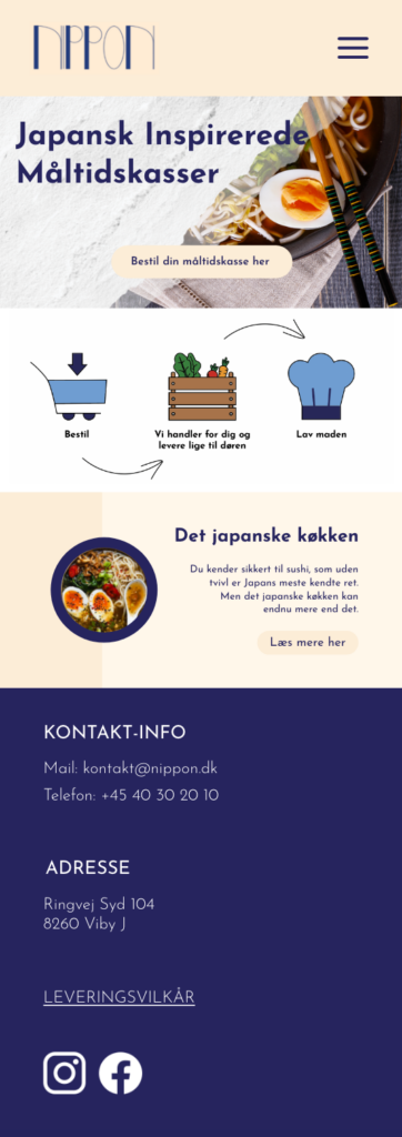 Som en 2. semester opgave har vi i et gruppeprojekt arbejde med det fiktive måltidskassefirma Nippon, som er inspireret af det japanske køkken. I opgaven har der været fokus på UX/UI design og at udtænke og designe en brugervenlig løsning.